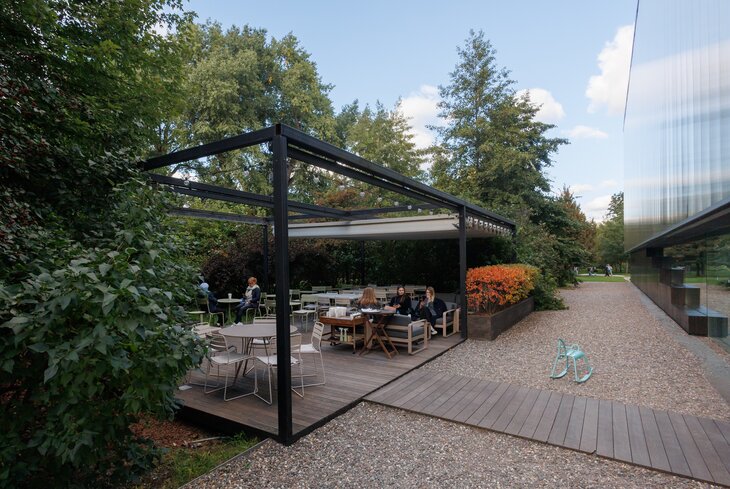 Кафе при музее «Гараж», где много света и места. Интерьер минималистичный, как в доме семьи Каллен: простая мебель и панорамные окна во все стены.