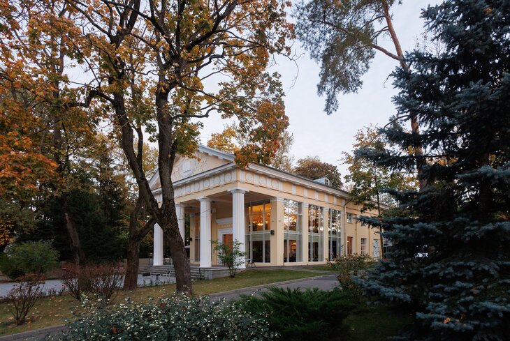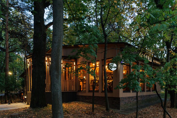 Небольшой домик с панорамными окнами и камином — почти что дом Калленов. Ресторан спрятан в глубине ландшафтного парка ВДНХ, среди деревьев у пруда, так что вид будет на лес и водоем.