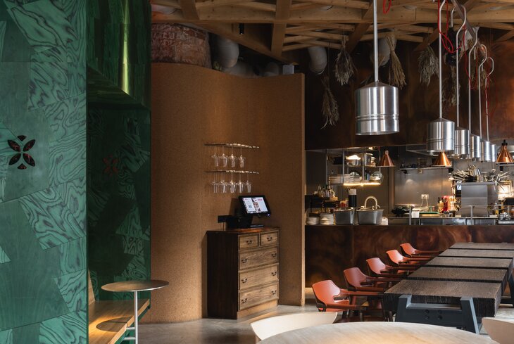 Демократичный корнер в стиле азиатского ангара. О нем тут напоминает рифленый металл, тертый кирпич на полу и потолок из деревянных досок. Меню такое же скромное — лишь один двухсторонний листочек с несколькими разделами: булочками бао (от 490 рублей), широкой лапшой бьян-бьян (720 рублей), горячими блюдами (от 470 рублей) и холодными закусками (от 320 рублей).