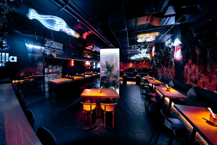 Заходишь сюда и попадаешь в типично тусовочное место. Тон ему задают пышная зелень, хип-хоп с утра до полуночи и неоновые надписи. Разумеется, светящееся изображение гориллы тоже есть. На кухне азиатские блюда переосмысляют в хулиганском стиле: в бургеры кладут реберное мясо (720 рублей) и вертят карамельную «Филадельфию» (890 рублей).