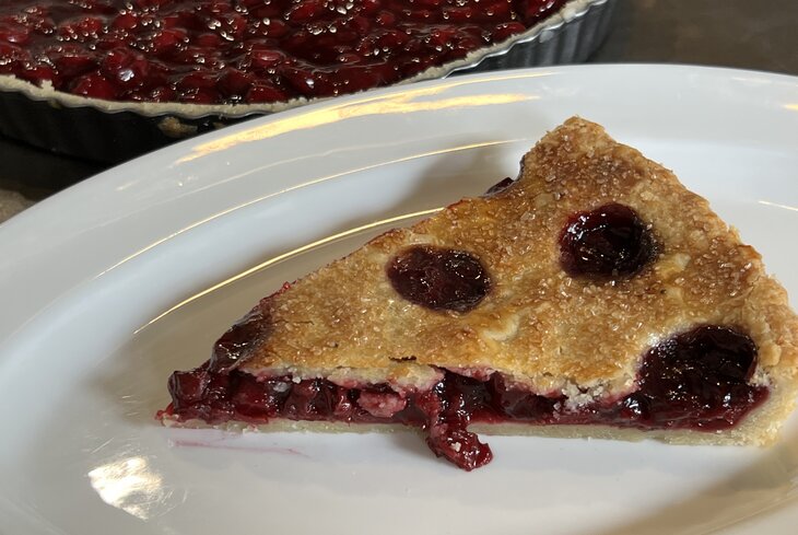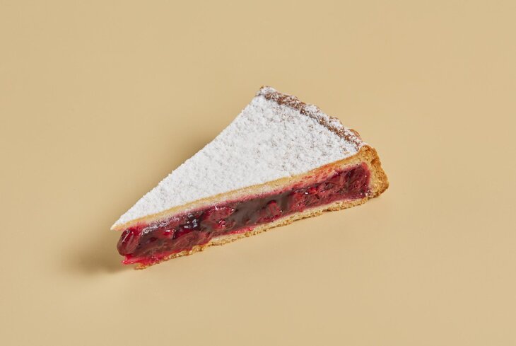 Кусочек пирога тут с привычным узором — сеткой. На тонком слое песочного теста разместился массивный слой вишневый начинки.