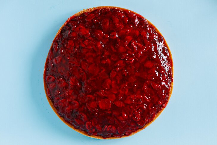 На тонкий слой песочного теста выложили миндальный крем, затем щедро посыпали вишней так, что получилась настоящая шапка из ягод.