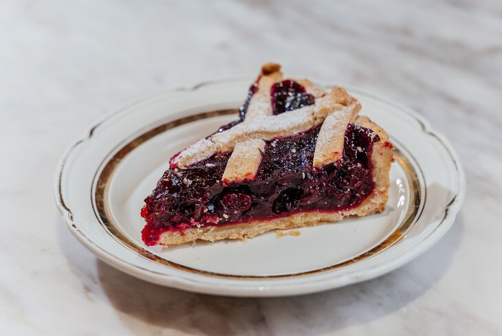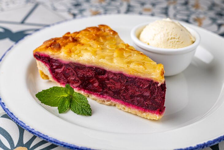 Любимый десерт агента Купера подают здесь с шариком ванильного мороженого. Сам пирог сделан из песочного теста, а начинка из вишни получилась пряной.