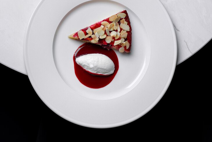 На тарелке — вишневый пирог, по форме напоминающий тарталетку, и щедрая порция мусса из сметаны.