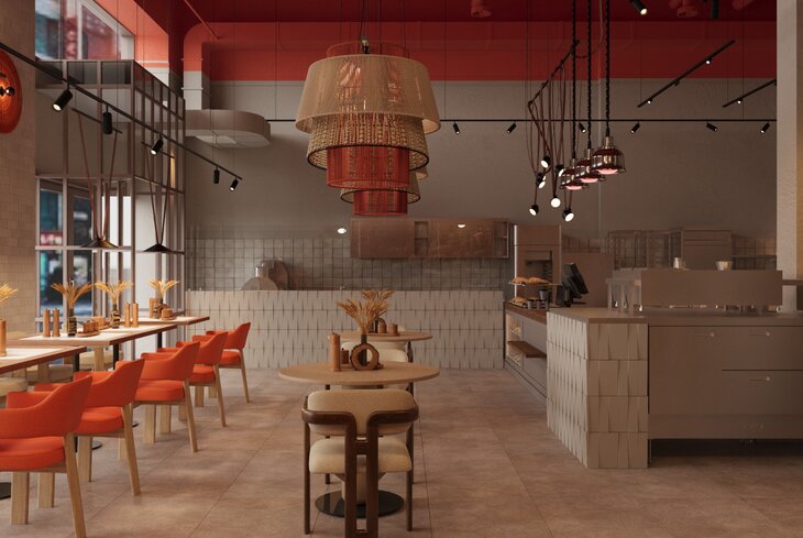 Декор помещения аскетично-графичный: кубические стулья и столы из пластика, металла и дерева и два прилавка — за одним варят кофе и булочки продают, за другим выпекают на глазах у посетителей.