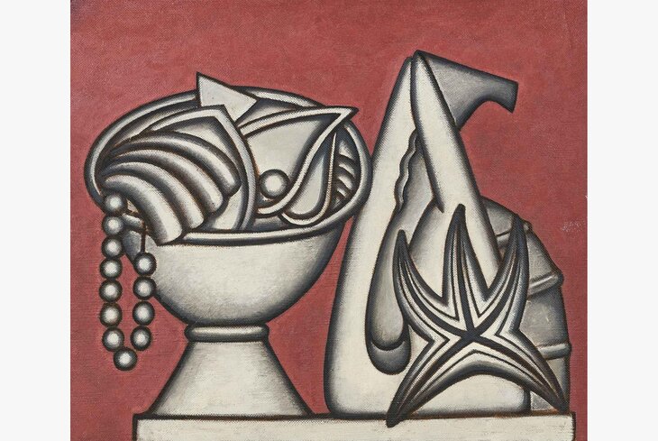 Дмитрий Краснопевцев. Ваза с раковинами, бусы и морская звезда на красном фоне. 1964. Коллекция фонда «Прометей»