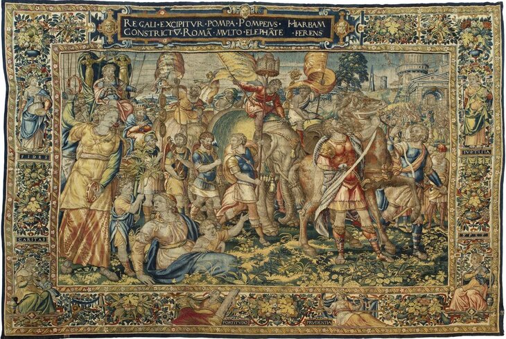 На выставке «Благороднейшие из тканей» в Пушкинском музее историю шпалерного искусства рассказывают на примере девяти редких экспонатов. Два из них — купленные музеем в 2014 году шпалеры «Триумф Помпея» и «Триумф Славы» — экспонируются впервые.