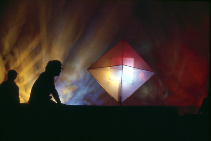 Кубическая установка создана, чтобы сопровождать музыкальные произведения: когда играет мелодия, внутри цвет меняется в зависимости от темпа и ритма композиций. Стенки инструмента были сделаны из зеркал, поэтому силуэты умножаются и отражаются на стенах, полу и потолке. Эту установку Булат Галеев, советский медиахудожник «Прометея», задумал как проект светоискусства — широкой известности она, конечно, не приобрела, но точно стала знаковой для эпохи.