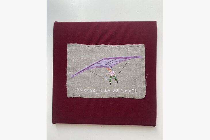 На выставке петербургского художника Саши Браулова самое яркое — «документальные» вышивки с цитатами. На небольших полотнах он вышивает надписи вроде «Надежду не задуть», «Спасибо, пока держусь» или «Подуй и пройдет». Есть и большие яркие баннеры с подобными высказываниями. Проект получился очень личным: здесь смешались детские воспоминания автора, кинематографические сюжеты и образы музыкантов.