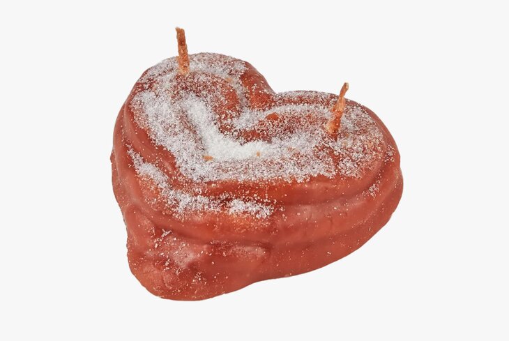 Идеальная плюшка в форме сердца с завитками, посыпанная сахарными кристаллами. Это ароматическая свеча, так что запах свежей выпечки дома обеспечен как минимум часа на четыре.