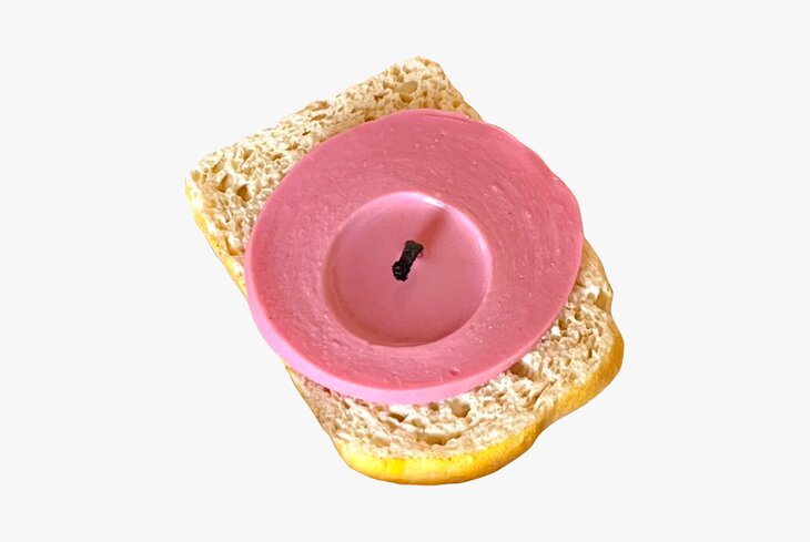 Очень аппетитная свечка из пчелиного воска в виде бутерброда с докторской колбасой. Горит такая недолго — всего три часа, зато выглядит просто очаровательно!