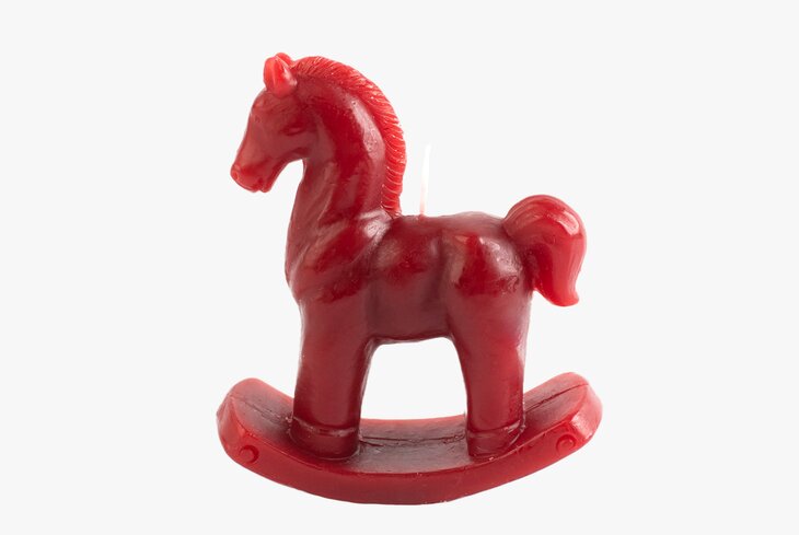 Красная лошадка-качалка высотой 12 сантиметров сделана из парафина — значит, гореть будет быстро.