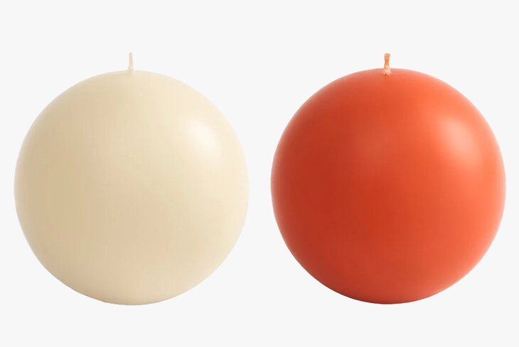 Еще одна парафиновая свеча. Диаметр шара небольшой — всего десять сантиметров. На выбор несколько цветов: кремовый, оранжевый, синий, серый и персиковый.