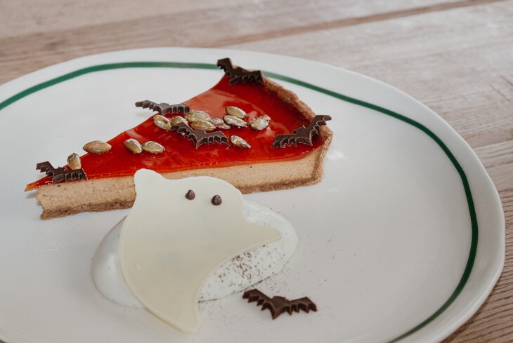Пряный флан из мускатной тыквы запечен на рассыпчатом печенье и покрыт тонкой глазурью с ароматом цитрусовых. Сверху его украсили летучими мышами из темного шоколада и привидением из белого.