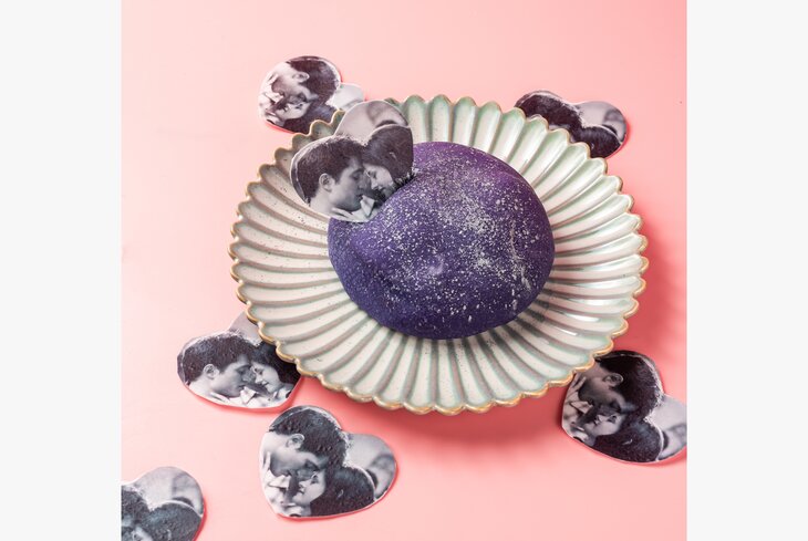Нежный и сливочный десерт подают с черничным конфитюром, свежей голубикой и печеньем савоярди. Сверху моти украшают фото Беллы и Эдварда из мастики.