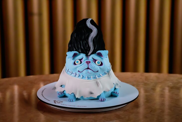 Торт весом больше двух килограммов, начинку для которого вы выбираете сами: «Красный бархат», «Три шоколада» или «Фисташка-малина». Болты на шее, чубчик и брошь делают из мастики. Заказывать такой надо заранее, минимум за пару дней.