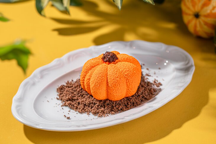Десерт делают на основе пюре из запеченной тыквы, добавляют туда сливочный мусс и кордиал. Подают такой корнеплод на шапке из шоколадной «земли».