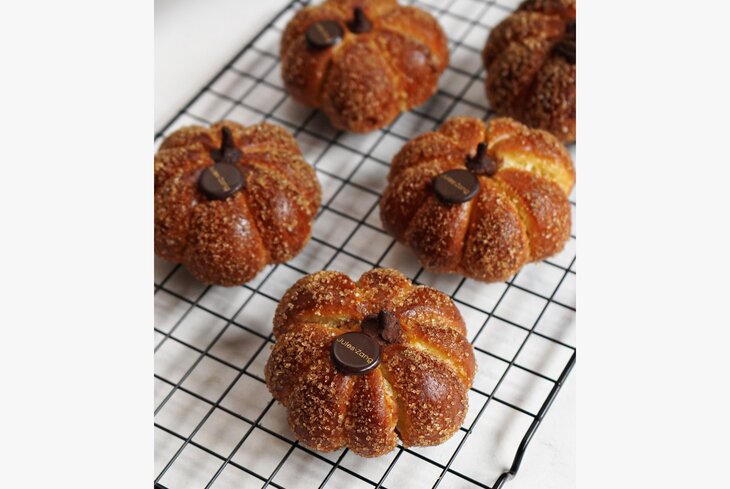 Эти ароматные тыковки — булочки бриошь с хрустящей корочкой. Внутри — апельсиново-шоколадный крем.