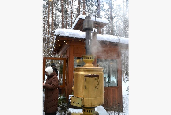 Главная особенность этого места — медный самовар на 150 литров, так что кипятка хватит всем. Лучшие места для чаепития находятся на деревянной веранде с видом на лес, но и внутри можно занять столик, если повезет. Локация очень популярная, так что готовьтесь постоять в очереди.