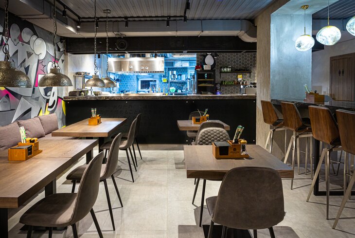 Здесь постарались воссоздать небольшой ресторанчик из переулков Токио. Поэтому в интерьере минимализм лишь с одним красочным акцентом, зато каким — огромной разрисованной стеной. В меню — паназиатские мисо-рамен со свининой (840 рублей), якисоба с уткой (640 рублей) и татаки из тунца (690 рублей).