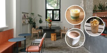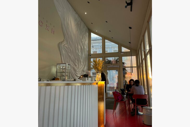 В кофейне-трапезной при Воскресенском храме нет ничего кричащего — все элементы сделаны с заботой о месте. Вокруг светильники, напоминающие перевернутые свечи, простое зеркало в полный рост и фрески пастельных тонов. Из любопытного в кофейной карте — латте с фисташкой и малиной (400 рублей).
