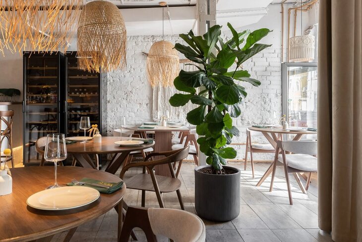 Осовремененная Грузия, которую стоит еще поискать в ресторане. И найдете, пожалуй, только в меню. А вот в интерьере с чисто белыми стенами и зелеными композициями о горной стране напоминают разве что фотографии с храмами. Зато в еде идут по канонам и готовят чашушули из телятины (640 рублей) и долму (510 рублей).