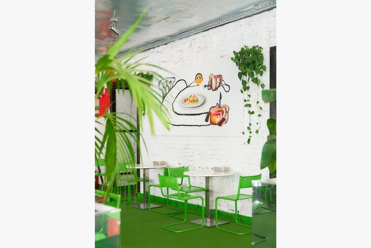 Быстрая подача, демократичные цены и атмосфера китайского бистро или даже рынка. О нем напоминают плакаты, свисающие фонарики и неоновые вывески. На них — азиатские супы (от 480 рублей) и много лапши (от 450 рублей), но самый большой раздел — с закусками: спринг-роллами с тофу (480 рублей), бататом фри (490 рублей) и жареными баклажанами (460 рублей).