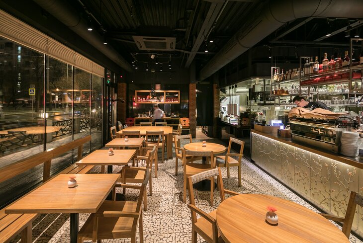 Бистро с неаполитанской пиццей, булками и завтраками до 16:00. Из утреннего меню берите тако-панкейки из батата с лимонным йогуртом (570 рублей) и гранд-сырник с черникой (590 рублей). А из основного — мортаделлу и стейк из вешенок (1 100 рублей).