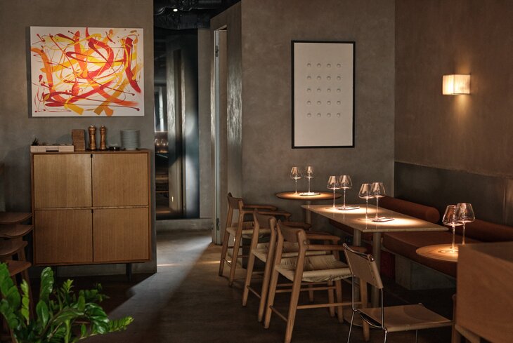 И хотя ресторан заявляет себя как домашний итальянский, в интерьере вы не обнаружите согревающих оттенков, уютного текстиля и такой же музыки на фоне. Вместо этого — пастельные стены, кресла-ракушки и атмосфера тихого погребка. А в меню — фетучини с креветками (820 рублей), мидии в сырном соусе (990 рублей) и салат с бурратой (790 рублей).