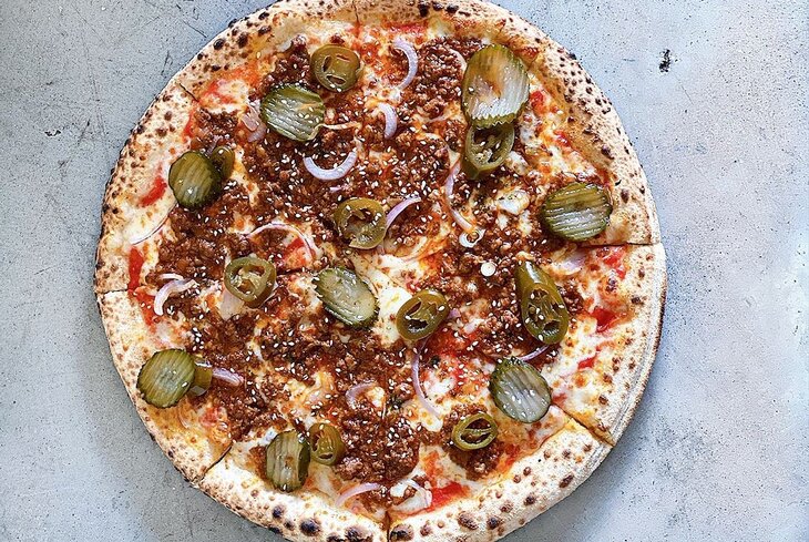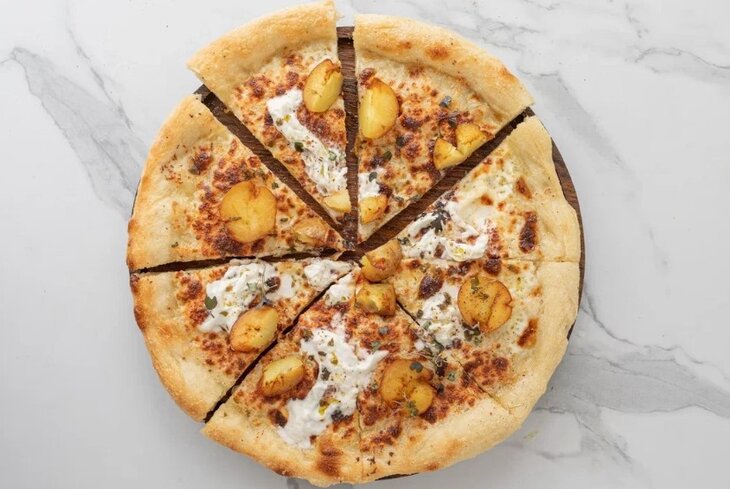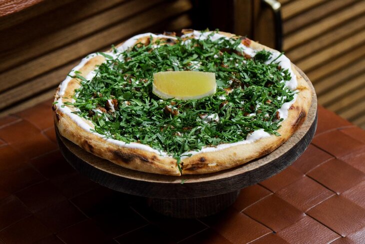 Тут пиццу с ягненком готовят в ближневосточном стиле с дрожжевым тестом и мягким сыром лабане. При подаче блюдо посыпают ароматным заатаром — смесью трав.