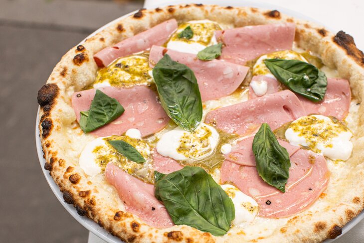 Фишка пиццы — фисташковое пралине, которое придает ей сладковато-ореховый вкус. Его сочетают со сливочной страчателлой и насыщенной мортаделлой.