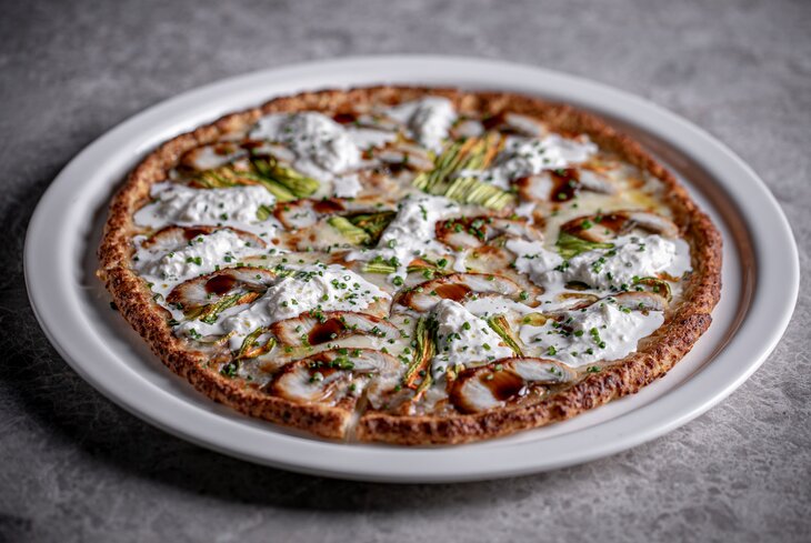 Основу для пиццы здесь предлагают выбрать: классическое тесто (1 750 рублей) либо альтернатива ему — смесь из цветной капусты и рисовой муки (2 050 рублей). Затем раскатанный круг покрывают сыром страчателла и слайсами угря и посыпают луком-сибулетом.