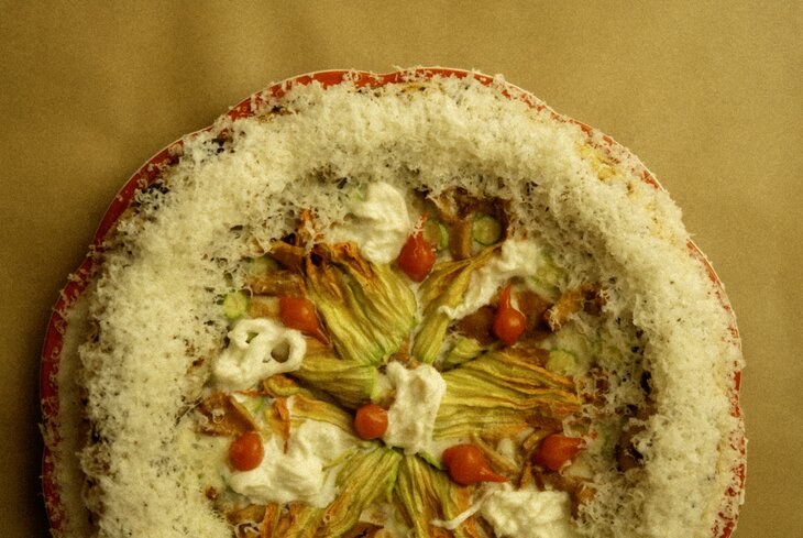 На тарелке — фотогеничный круг с лисичками, сверху которого два вида сыра — пекорино и страчателла. Для пущей нежности добавляют трюфельный бешамель и цветки цукини.