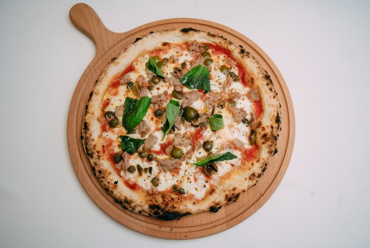 Пиццу готовят по-итальянски — с чисто средиземноморскими ингредиентами: консервированным тунцом, оливками и базиликом. Основа начинки — из томатного соуса и красного лука.