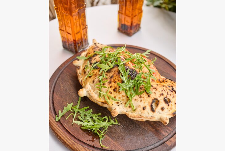 Закрытый вариант в виде пышного полумесяца. Внутри — тягучая начинка из моцареллы, шампиньонов и вареной ветчины.