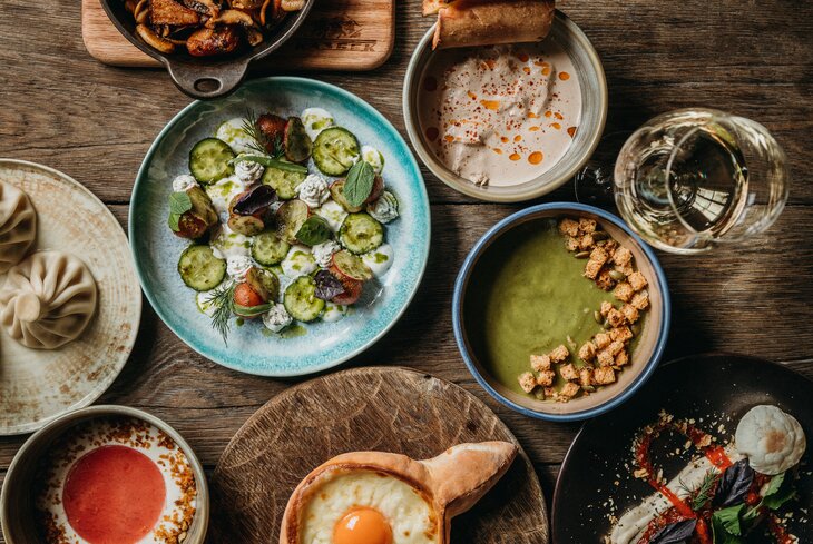 В этом же здании ресторан грузинской кухни. В меню бранчей здесь — четыре раздела. Из закусок берите ассорти солений, салат с кахетинским маслом и сациви с курицей. Не пропускайте лист с хачапури: тут все главные хиты — по-аджарски, по-мегрельски и по-имеретински. Из горячего присмотритесь к оджахури со свининой, толме с телятиной и кебабу.