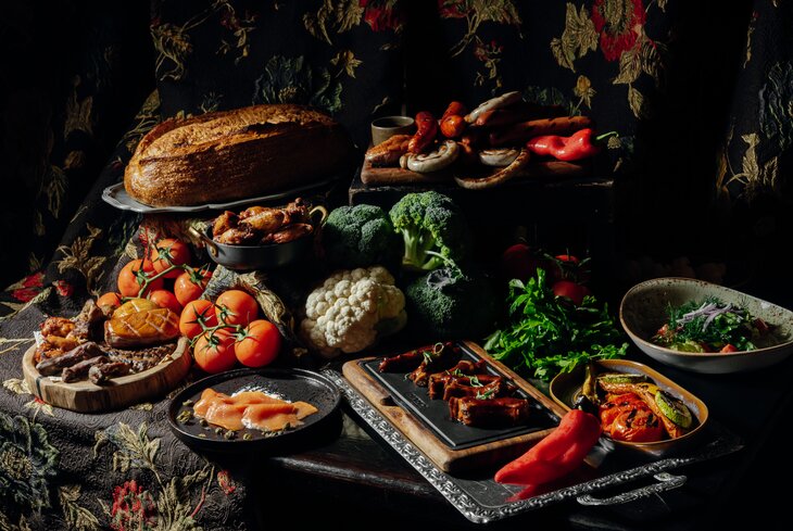 В выходные в мясном ресторане на Краснопресненской набережной делают акцент на блюдах на гриле. Свиные ребра барбекю, стейки, шашлык из языка ягненка и колбаски — все делают на открытом мангале. Помимо этого, предлагают и холодные закуски вроде паштета из куриной печени с крыжовником, соленой семги и телячьего студня. Еще можно взять сибирский борщ с говядиной, щи с квашеной капустой, а к ним — чебуреки и беляши с мясом.