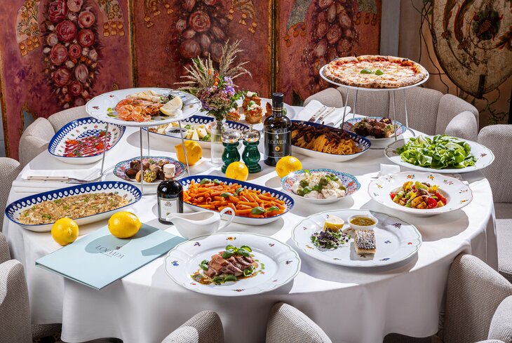 В меню бранча в роскошном ресторане недалеко от шумных Патриков соединили любимые блюда шефа-итальянца и классику с Апеннинского полуострова. На столах — более 20 блюд. Для старта — карпаччо из утки с перечным соусом, кальмары фритто и баклажаны пармиджано. Не обошлось без пиццы «Маргарита» с лазаньей и четырех видов пасты.