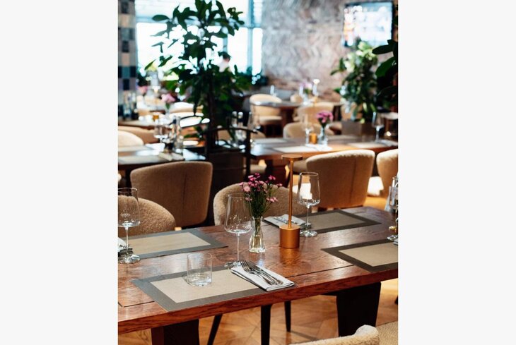 Ресторан с бежевым интерьером, зеленью и европейской кухней. Из меню заказывайте батат фри с пармезаном (690 рублей), лосось (450 рублей) или филе миньон (2 200 рублей).