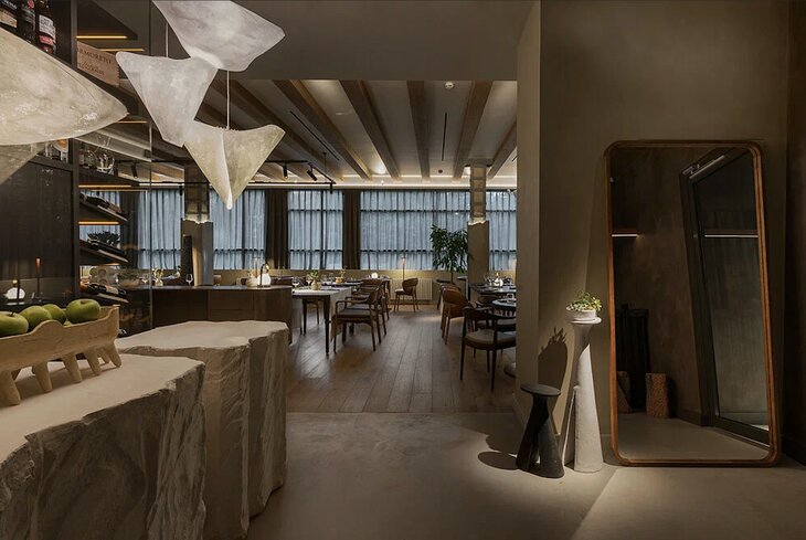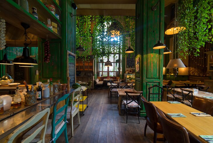 Ресторан возглавляет итальянский шеф Кристиан Лоренцини — он учился готовить у своего отца-тосканца. Атмосфера тут по-настоящему домашняя: деревянная мебель с потертой краской, ставни на окнах и зелень, свисающая с высоких потолков. На стенах — личные фото шефа и сувениры из его путешествий. В меню классические итальянские блюда неожиданно сочетаются с азиатскими и русскими мотивами. Например, можно попробовать ризотто том-ям (1 180 рублей) или запеканку из артишоков (840 рублей).