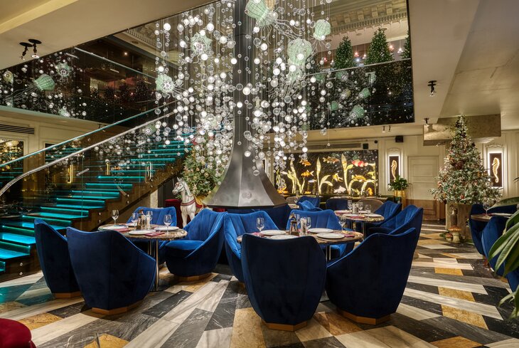 Меню здесь состоит из морепродуктов и рыбы. Берите тартар из тунца с чукой (2 700 рублей), зеленый салат с семгой горячего копчения (1 890 рублей) и черные пельмени из нельмы (1 600 рублей). Сидеть будете под огромной хрустальной люстрой и скульптурой Посейдона в трусах.