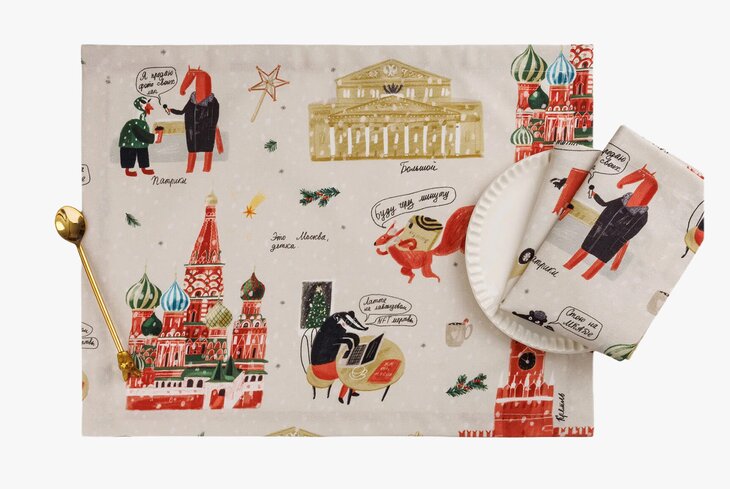 Столовые салфетки из 100-процентного хлопка, а на них — снегопад и знаковые московские места вперемешку с животными. Здесь и конь в пальто на Патриках, и курьер-белка, и енот с латте на лавандовом. Чтобы изображение оставалось как можно дольше ярким, на салфетку нанесли водоотталкивающую пропитку.