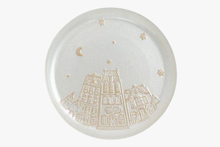 Очаровательное стеклянное блюдо с заснеженным городом диаметром 21 сантиметр. Рисунок выполнили в нежном цвете шампань, а еще нанесли безопасные золотые блестки для пущего эффекта.