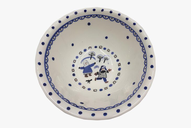 Иллюстратор Соня Уткина перенесла на глубокую тарелку лубочных героев. На дне пол-литровой керамической миски она изобразила сюжет «Детвора» — мальчика и девочку на заснеженной поляне.
