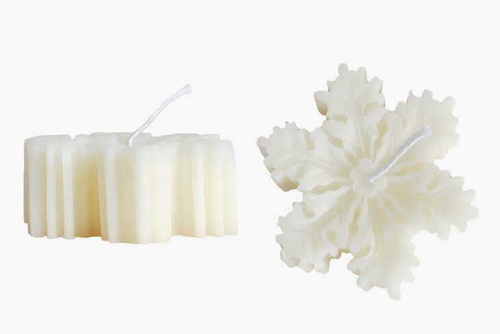 Набор трех снежинок из смеси соевого и пчелиного воска. Такие свечи горят вполовину дольше, чем, например, парафиновые, а еще практически не дают копоти и нагара. Каждая весит 50 граммов.