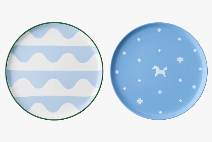 Две голубые тарелки из фарфора диаметром почти 24 сантиметра. На первой — снежинки с лошадкой, на другой — одни сугробы.
