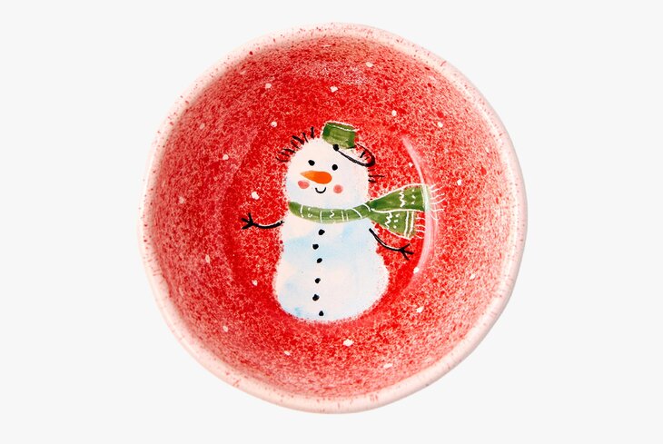 Керамический соусник подойдет, пожалуй, только для холодных вечеров. На дне на красном фоне нарисован улыбчивый снеговичок в зеленом шарфе. Объем менажницы — 100 миллилитров.