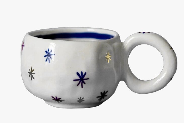 Объем чашки — 300 миллилитров, так что точно хватит для долгого чаепития. Ее вручную изготовили из полуфарфора и расписали. Некоторые снежинки остались синими, а другие покрыты настоящим золотом.