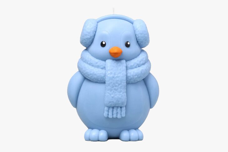 Милейший пингвиненок в шарфе и меховых наушниках приготовился к холодам. Он сделан из соевого воска и покрашен в голубой цвет.