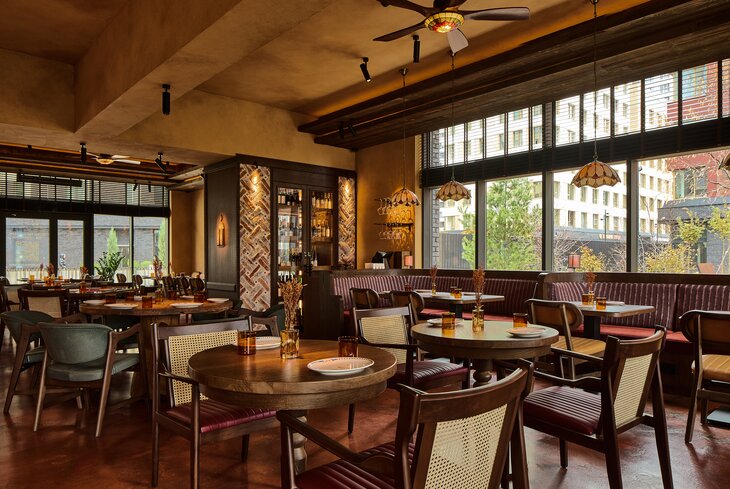 Еще немного Турции, на сей раз от Folk Team, сделавшей бросок из центра города аж к метро «Спартак». Формат «Тюрки Diner» синтетический: с одной стороны, интерьер косплеит ретродайнеры, а фоном идет американская музыка 1960–1970-х годов, с другой — на кухне задействованы тандыр, казан и мангал, где выпекают восточные лепешки и самсу, томят плов и парят манты.